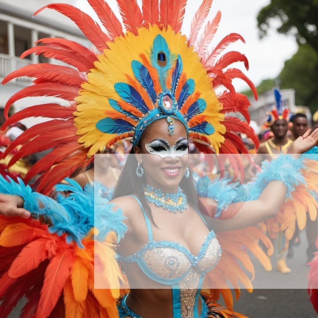 A carnival parade with dancers in elaborate costumes and bright feathers