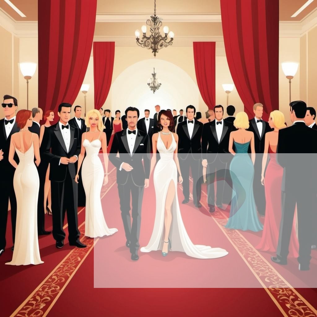 A glamorous Hollywood red carpet event, with paparazzi and celebrities in elegant outfits