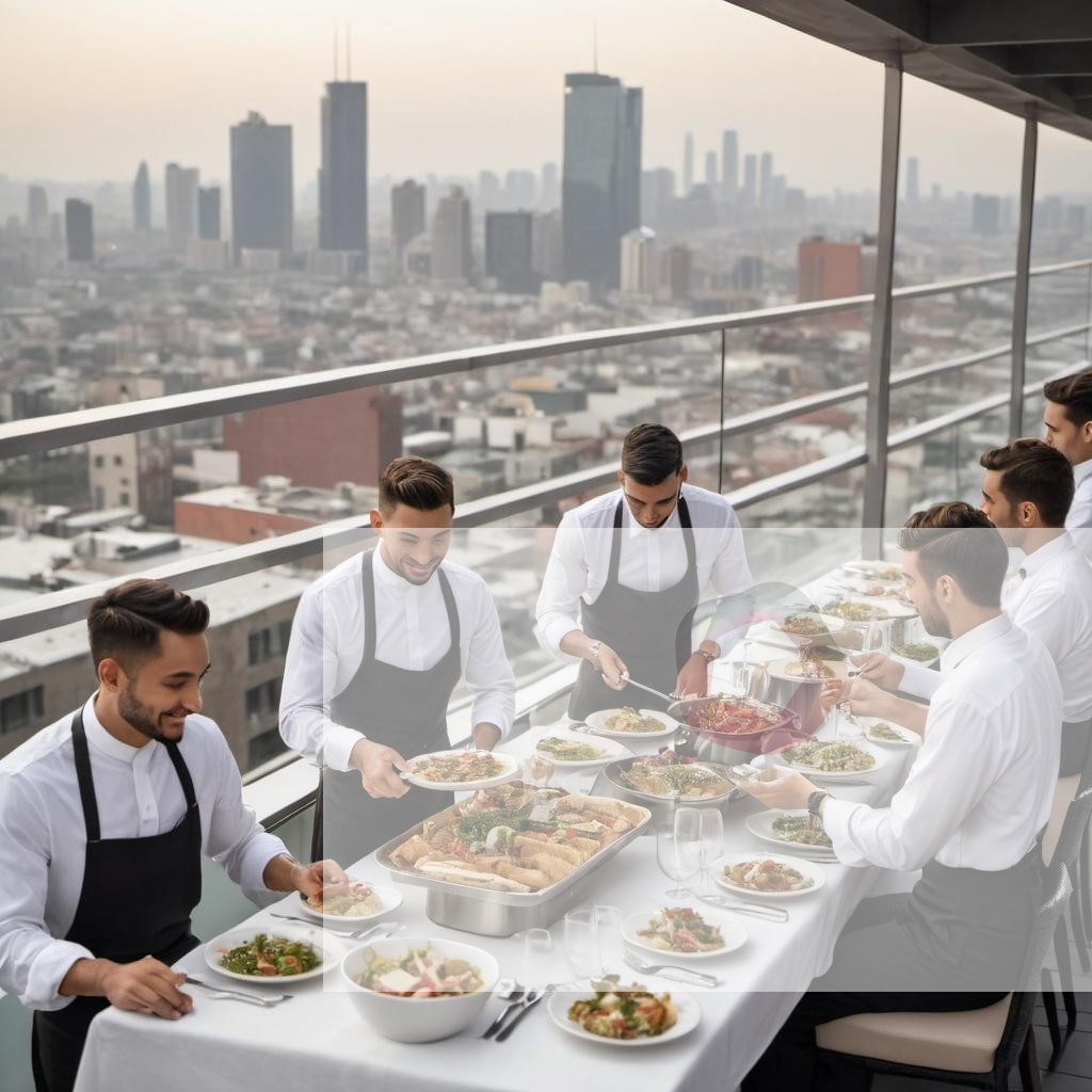 A waiter serving food to a table of friends in a modern rooftop restaurant with a city view
