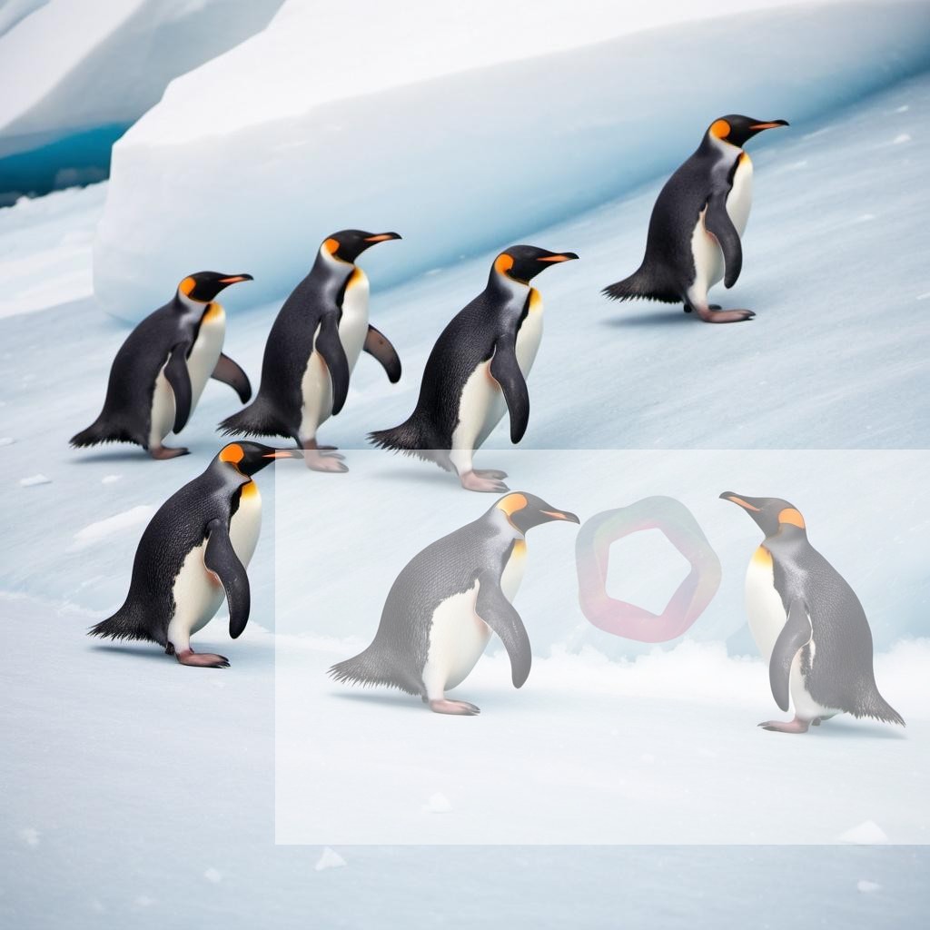 A group of penguins sliding down an icy slope in the Antarctic, with snowflakes falling around them
