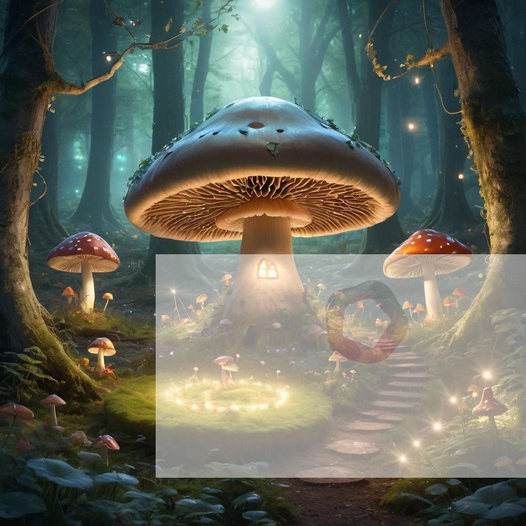 A magical forest glade with fairies dancing around a glowing mushroom circle