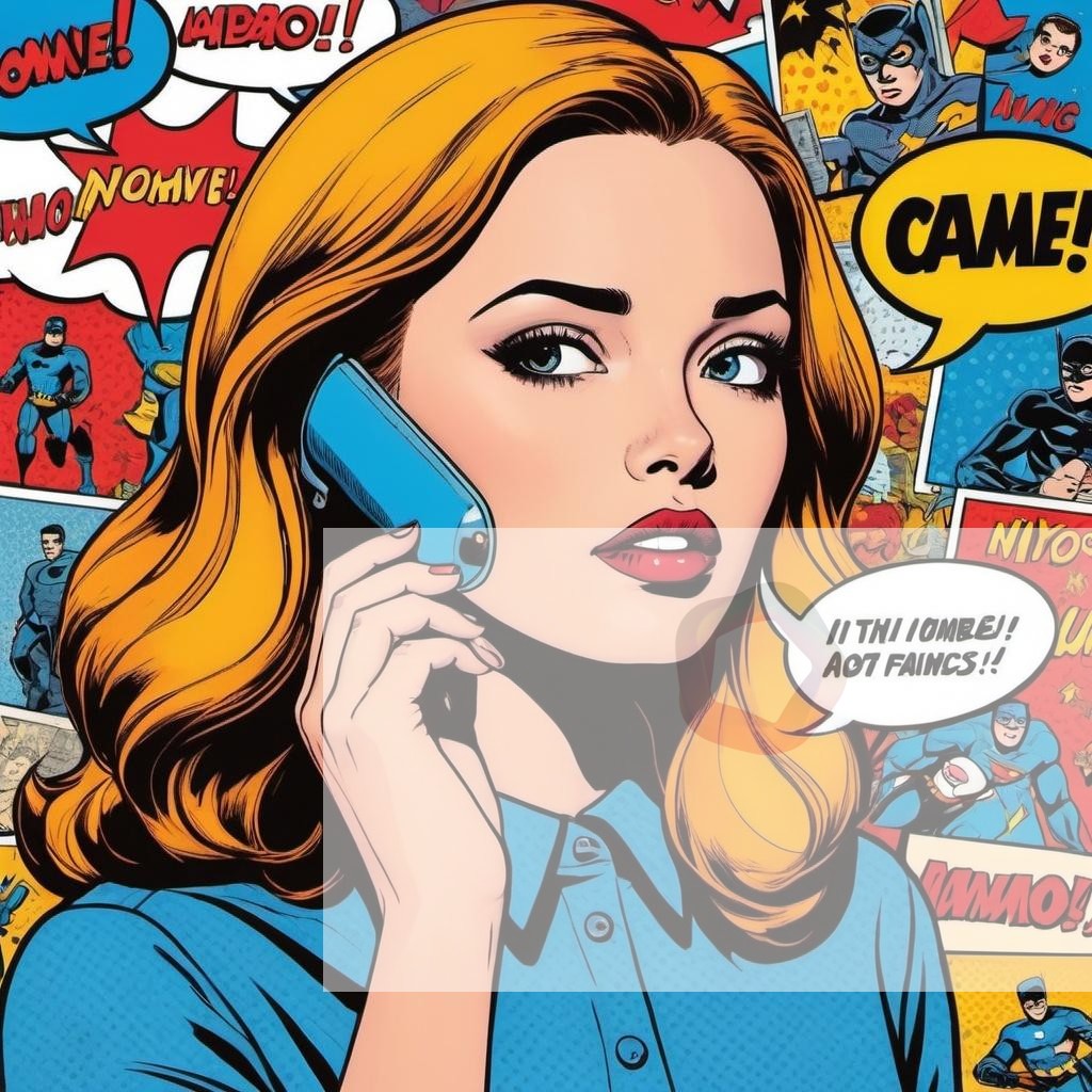 A pop art piece with comic book-style illustrations and speech bubbles