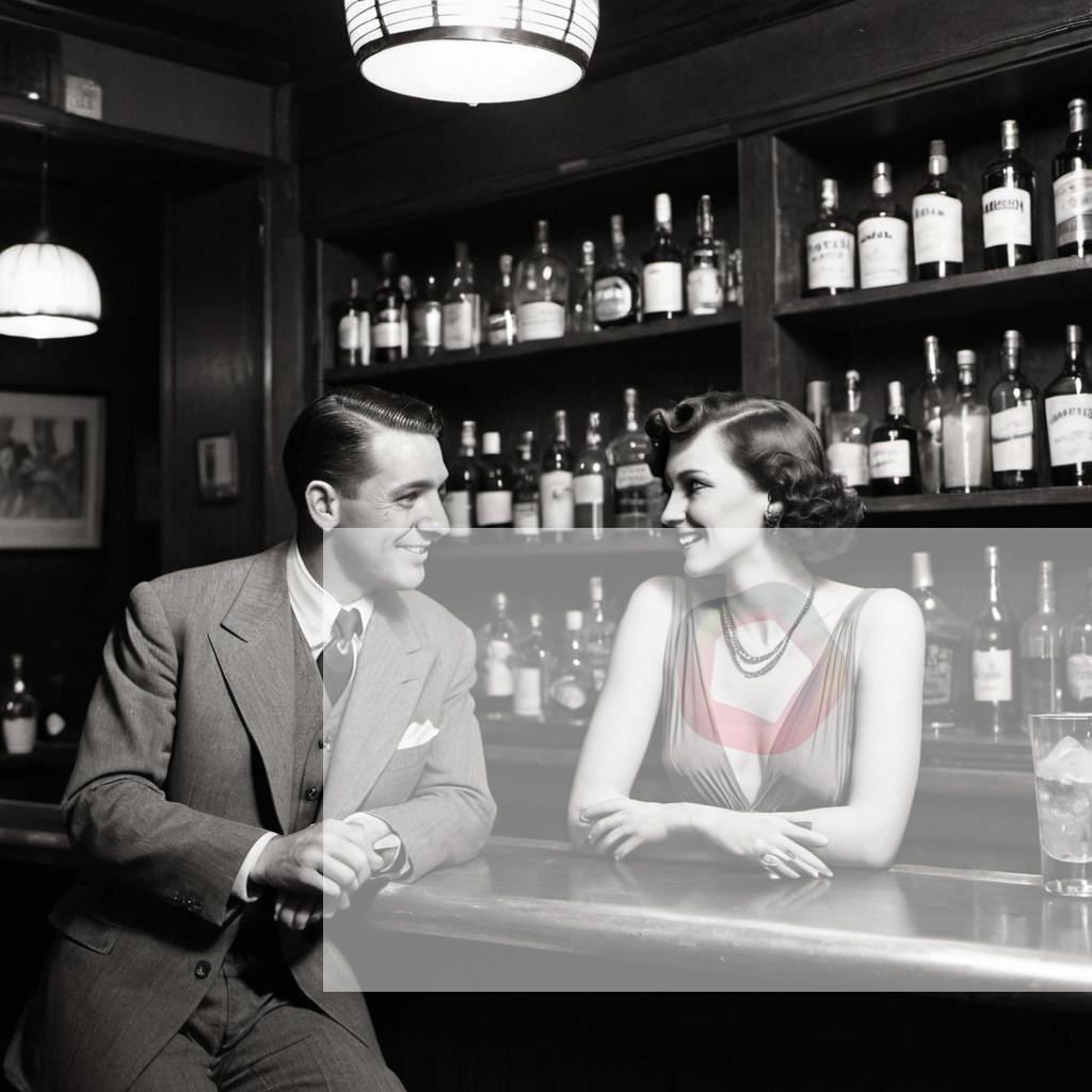 A couple sitting at the bar in a speakeasy, enjoying craft cocktails