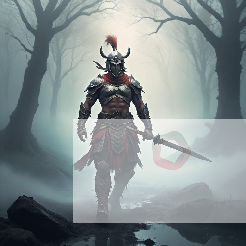 A fantasy scene with a warrior, in a photorealistic style, featuring foggy atmosphere.