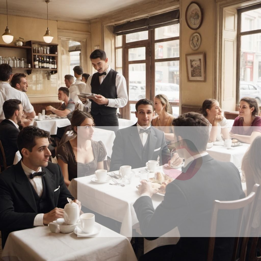 A waiter taking orders from a table of friends in a bustling cafe
