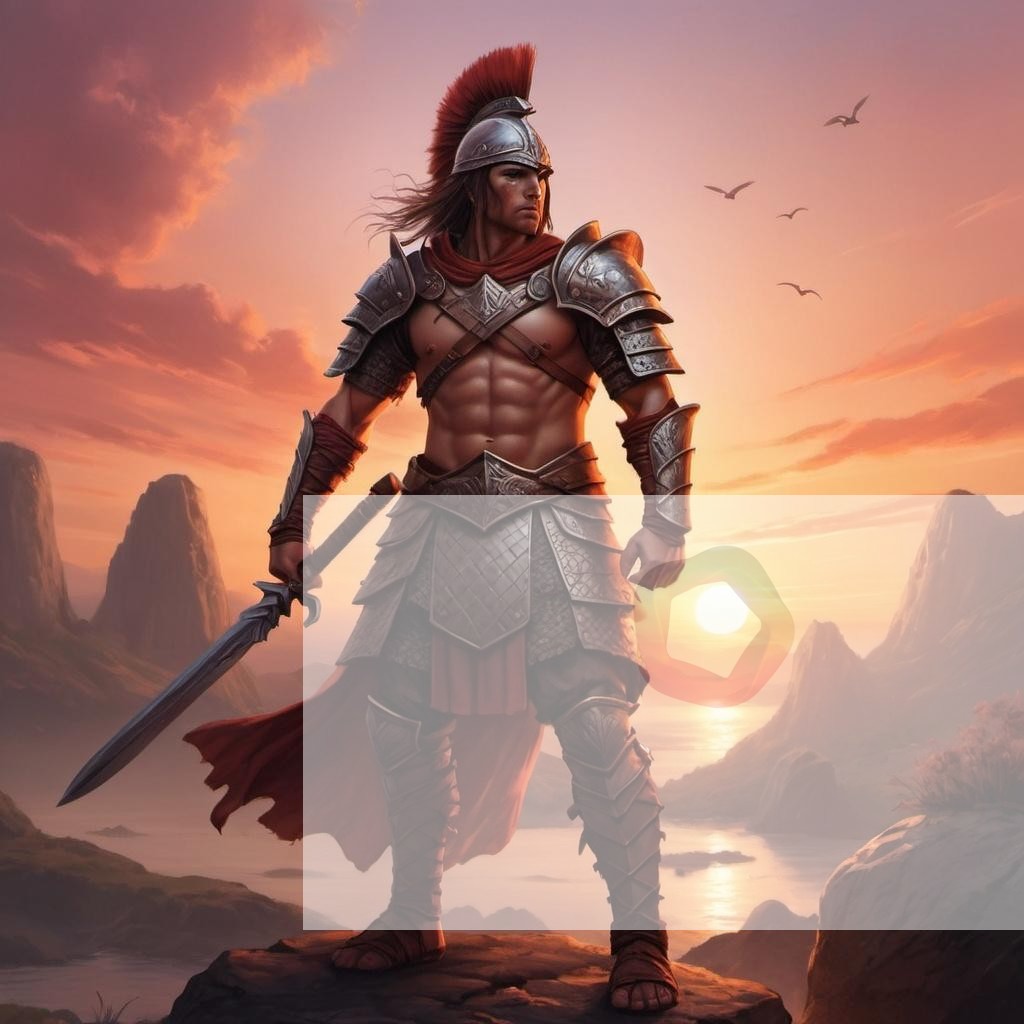 A fantasy scene with a warrior, in a surreal style, featuring sunset background.