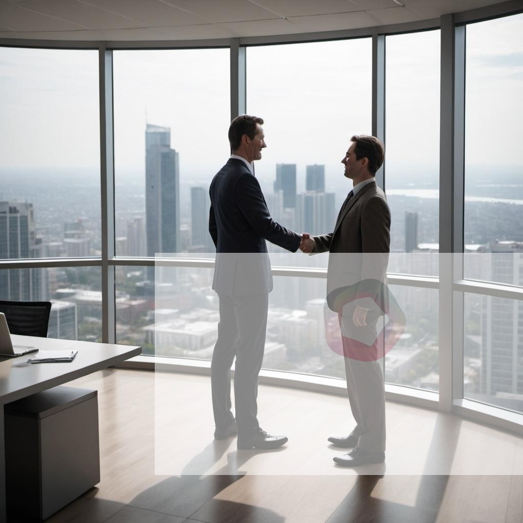 A businessman shaking hands with a partner in a high-rise office with a city view