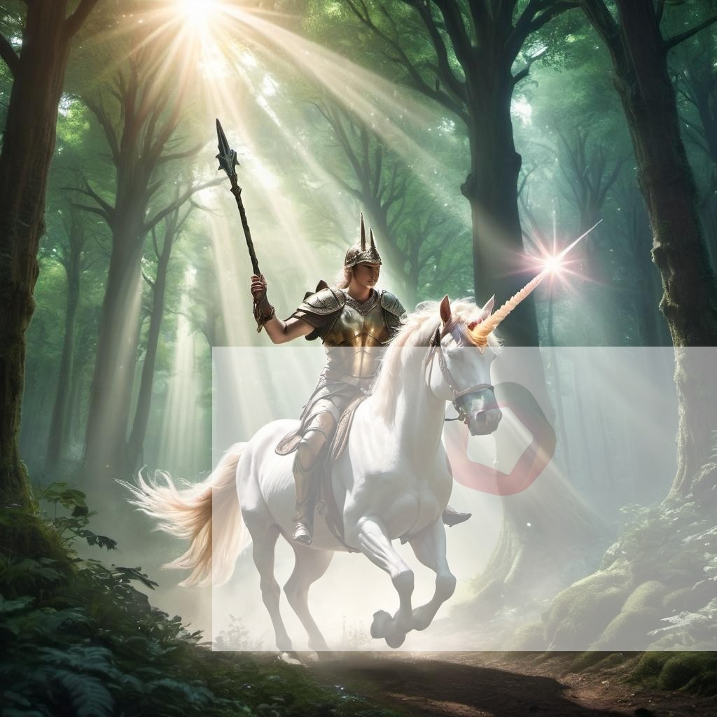 A warrior riding a unicorn through a mystical forest with beams of light filtering through the trees