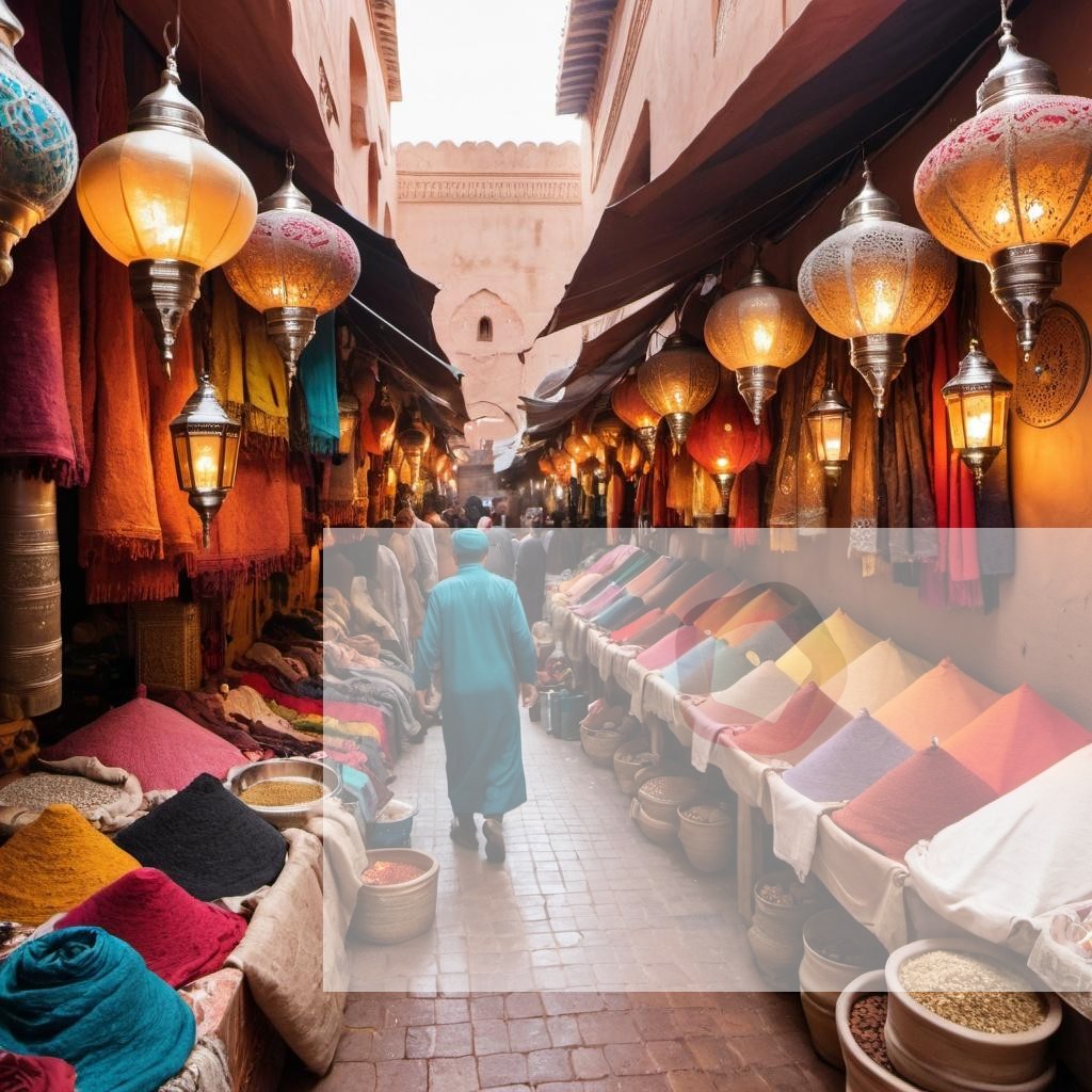 A bustling Moroccan market with colorful fabrics, spices, and intricate lanterns