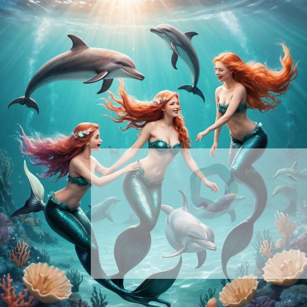 A group of mermaids playing in the ocean; surrounded by dolphins