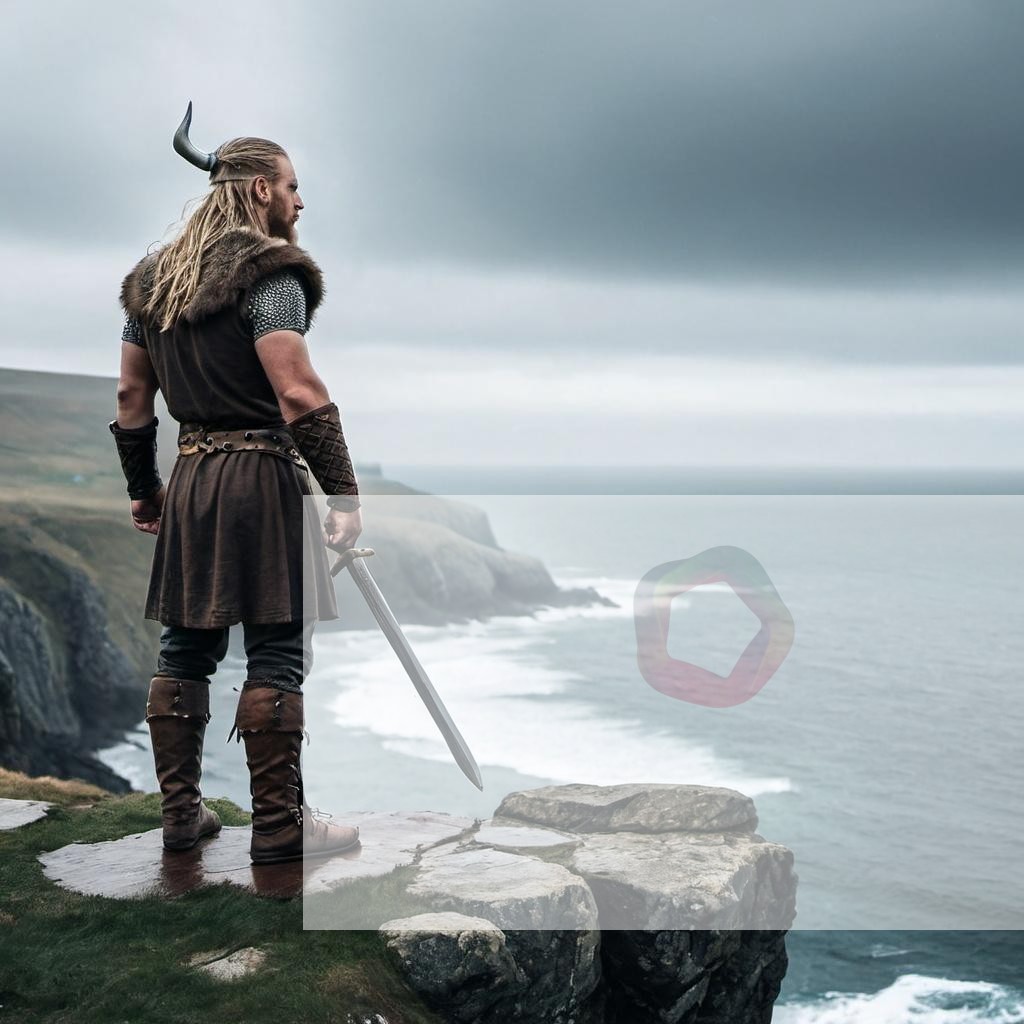 A Viking warrior standing on a cliff; overlooking the sea