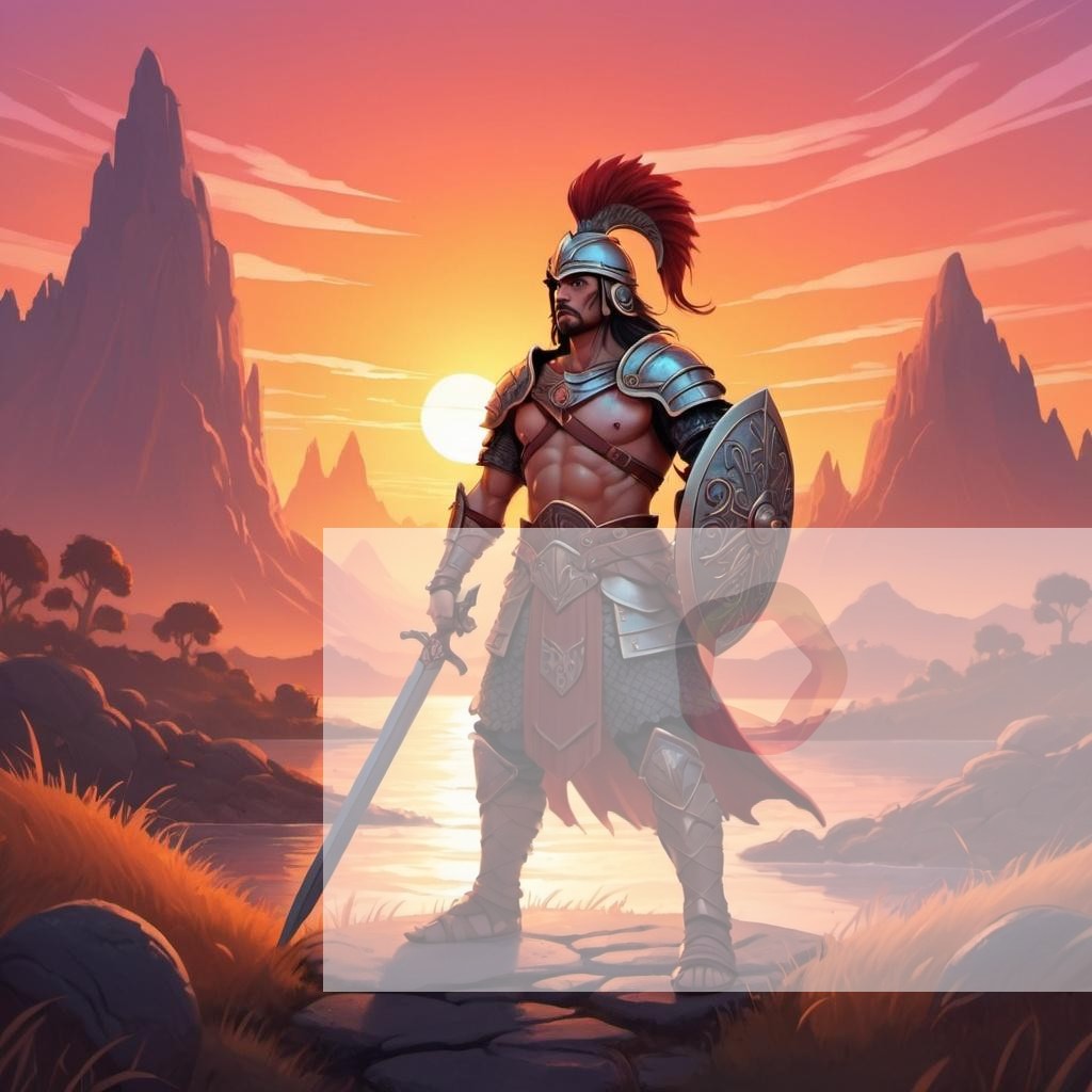 A fantasy scene with a warrior, in a cartoonish style, featuring sunset background.