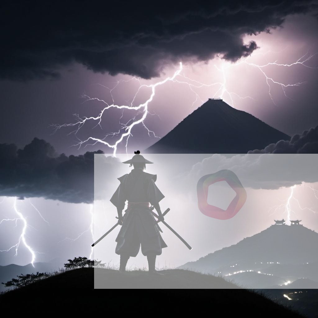 A samurai standing on a hilltop during a storm lightning illuminating his silhouette