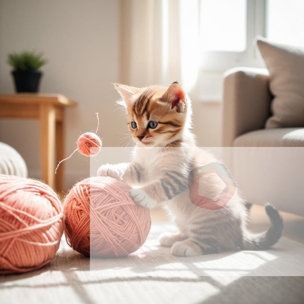 A cute kitten playing with a ball of yarn in a sunny room filled with soft cushions