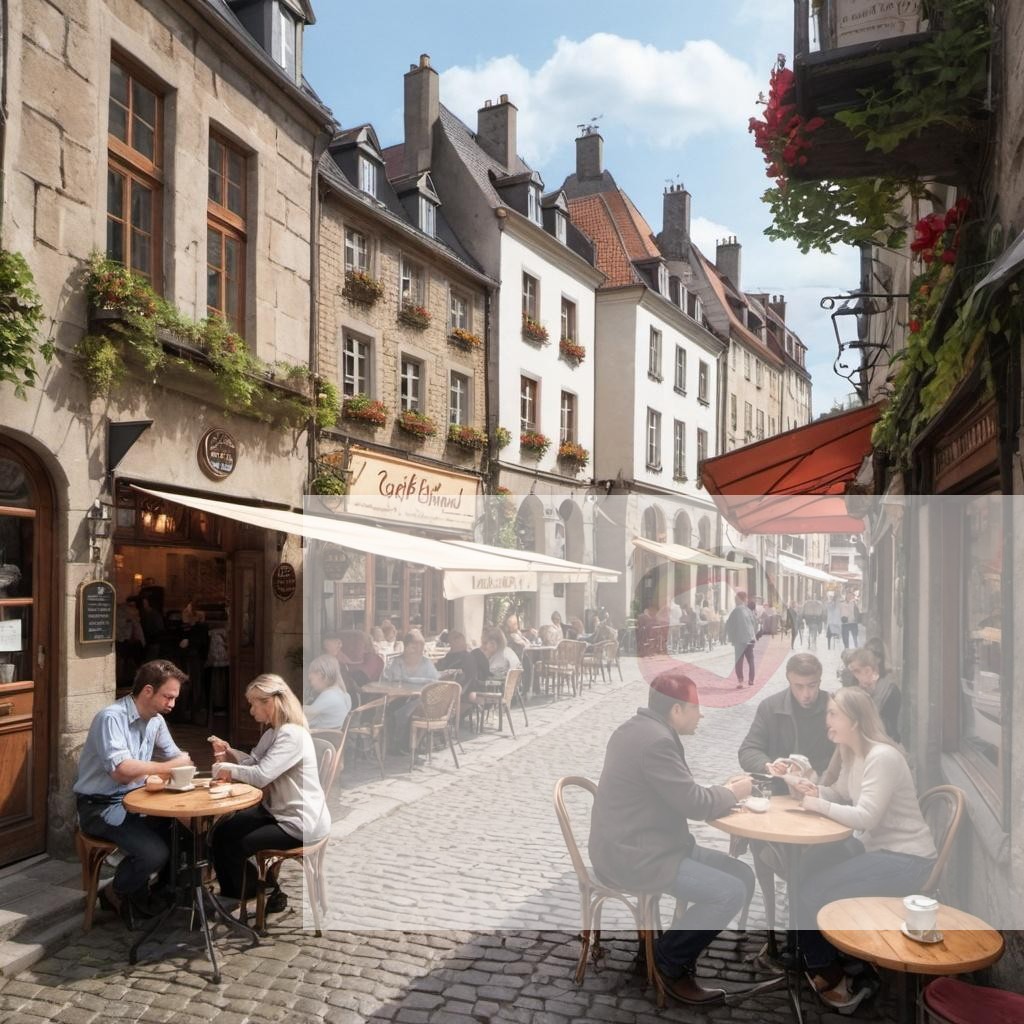 A quaint European caffe on a cobblestone street, with tables outside, people chatting, and a musician playing