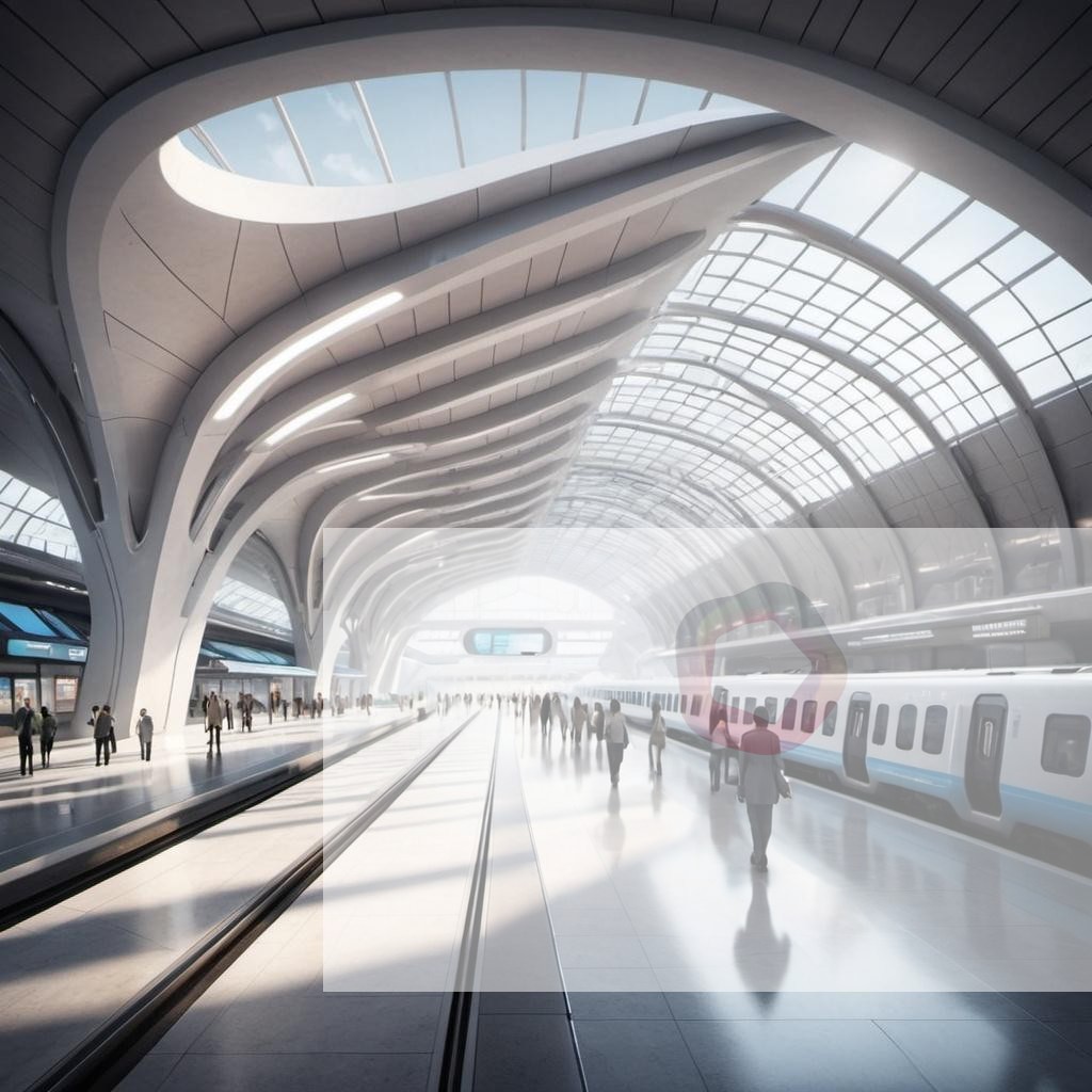 A futuristic skyscraper with glass walls and sleek curves, set against a city skyline