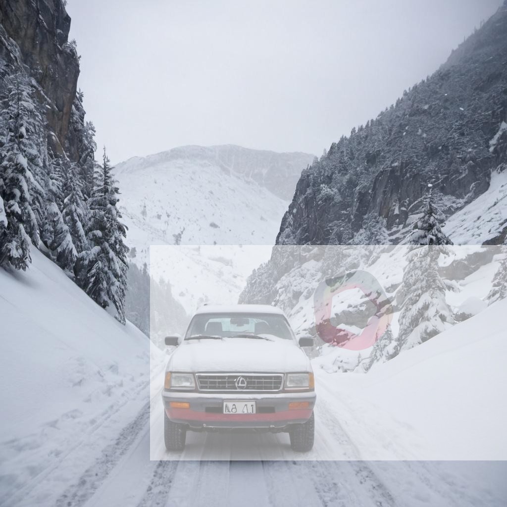 A car with snow chains driving up a snowy mountain road