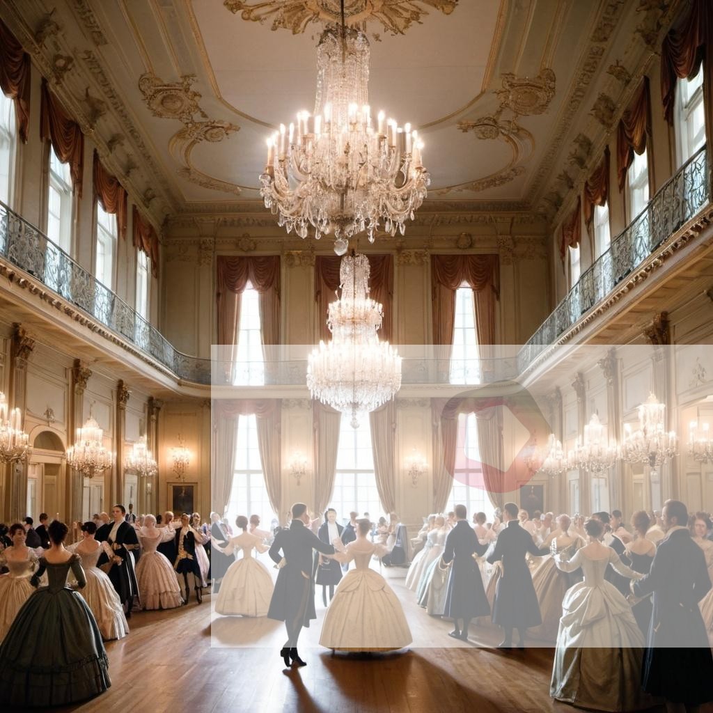 An elegant ballroom filled with dancers in 18th-century attire, chandeliers sparkling overhead