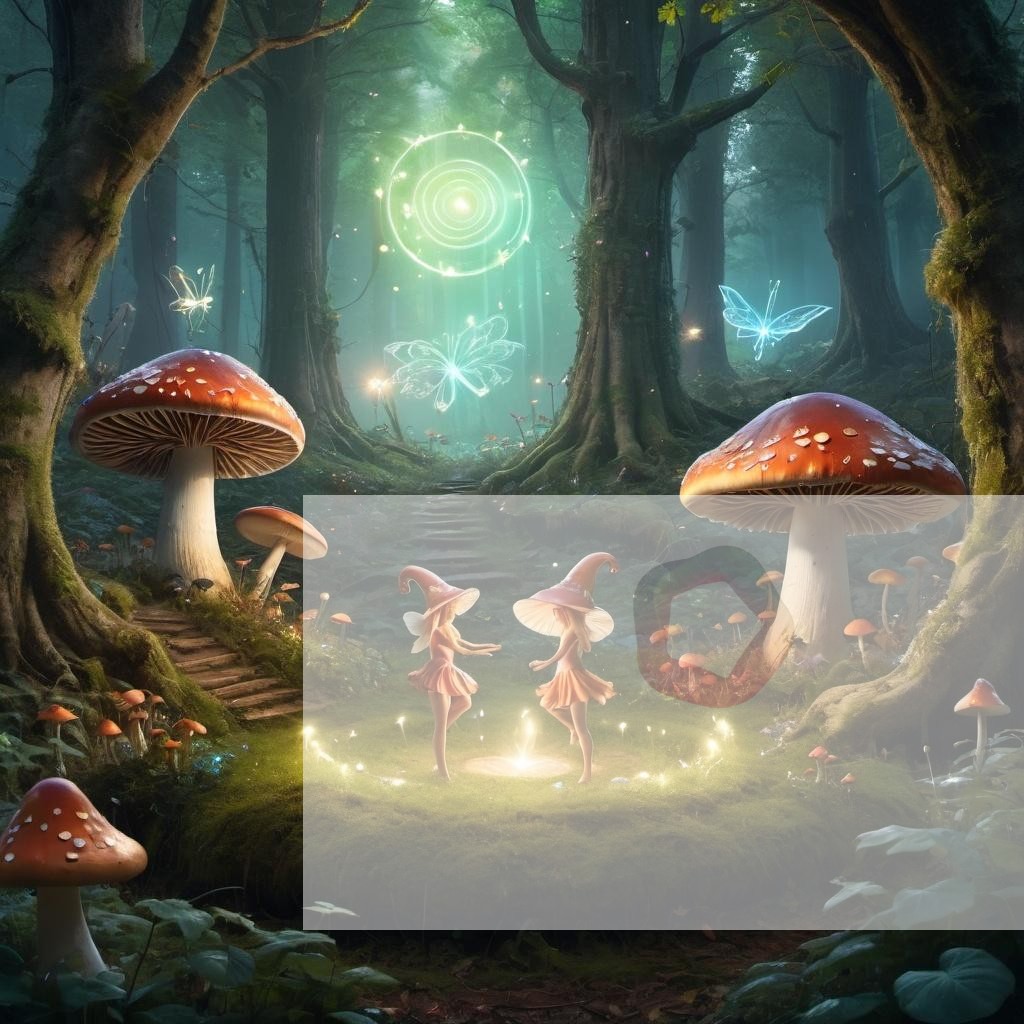 A magical forest glade with fairies dancing around a glowing mushroom circle