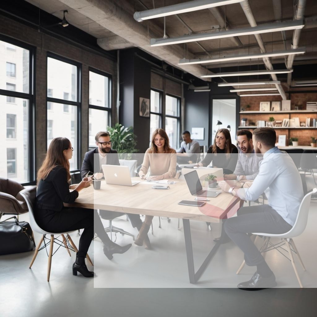 A team of marketers discussing a campaign in a trendy office space