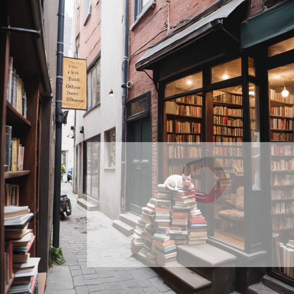 A small cozy bookstore in a narrow alleyway with books stacked high and a cat sleeping in the window