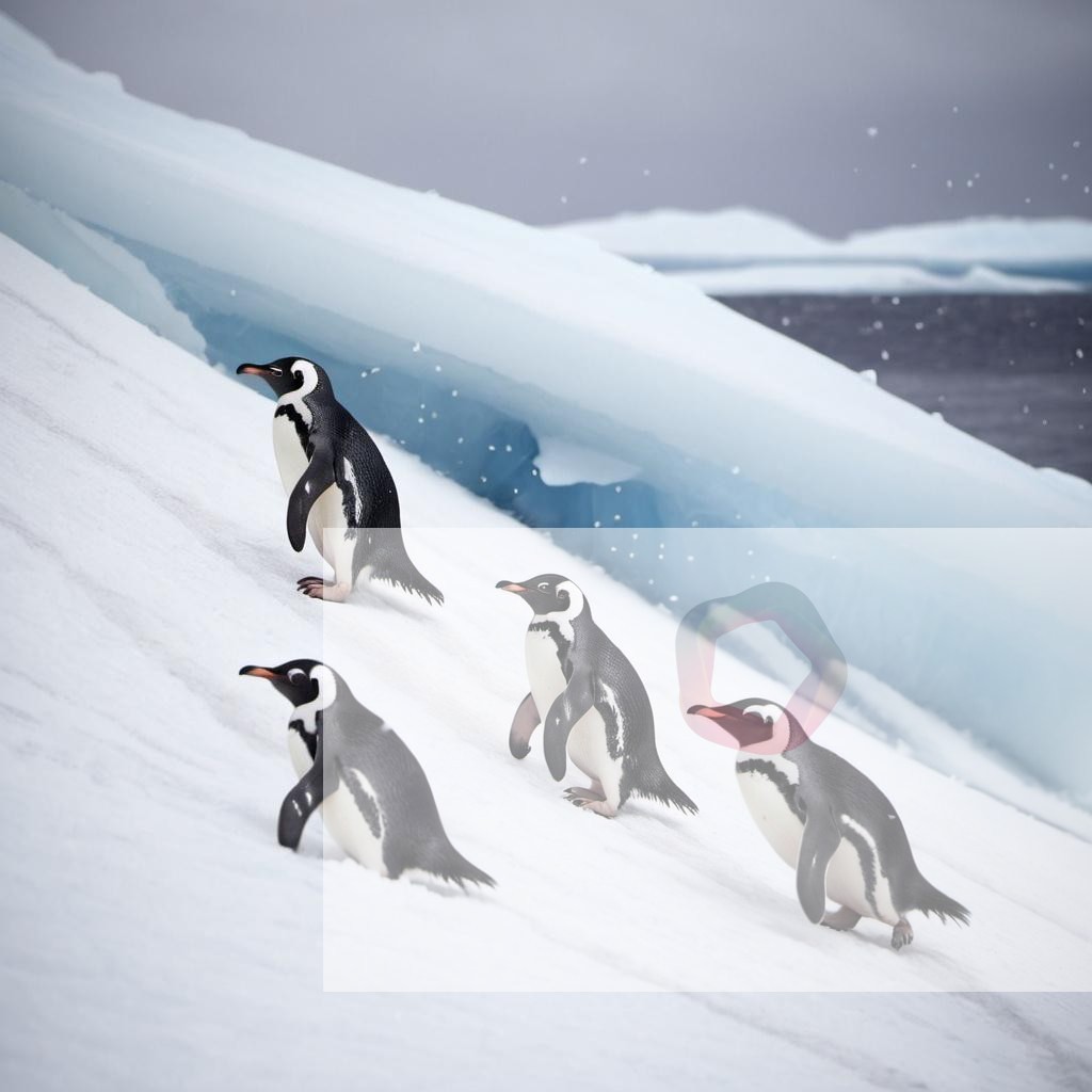 A group of penguins sliding down an icy slope in the Antarctic with snowflakes falling around them