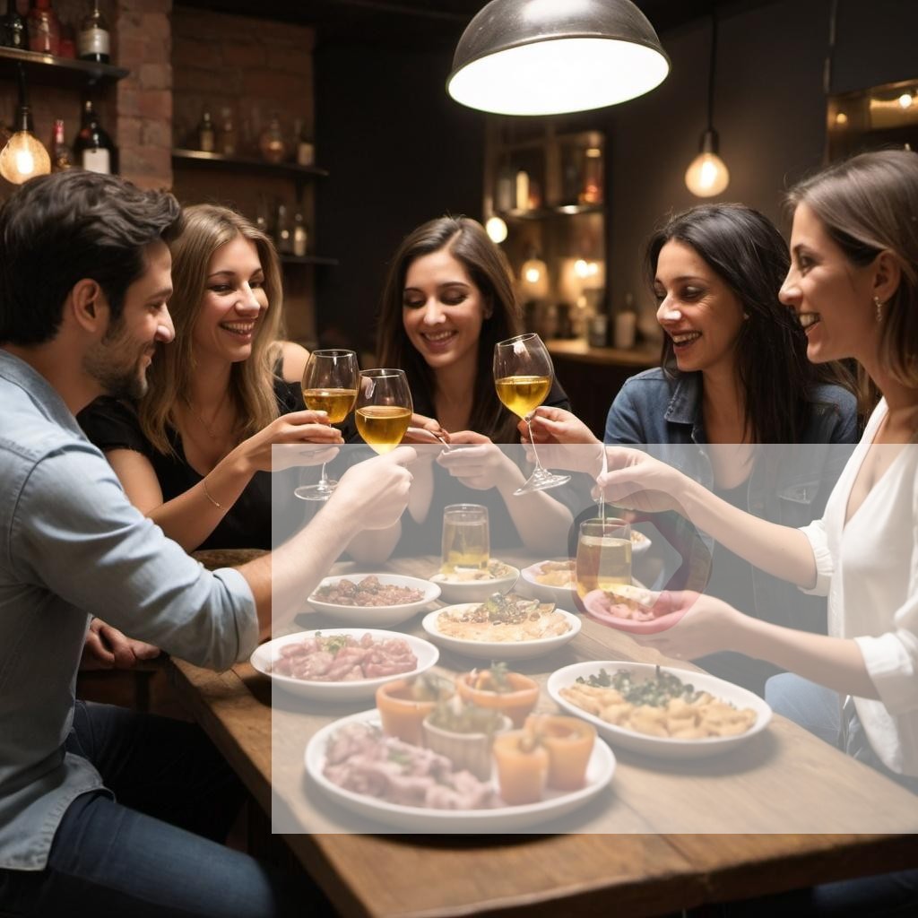 A group of friends enjoying tapas at a bustling Spanish tapas bar
