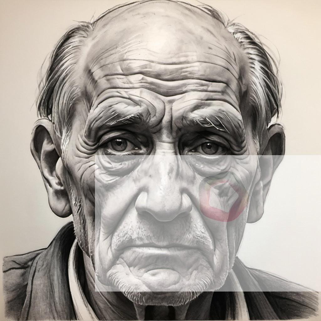 A realistic charcoal portrait of an elderly man with deep lines and wrinkles