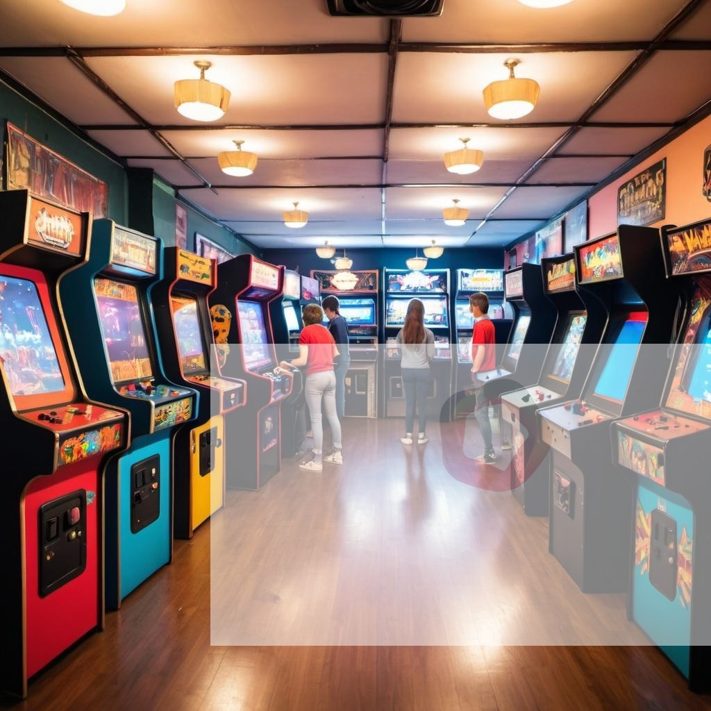 A retro arcade filled with vintage game machines teenagers playing enthusiastically