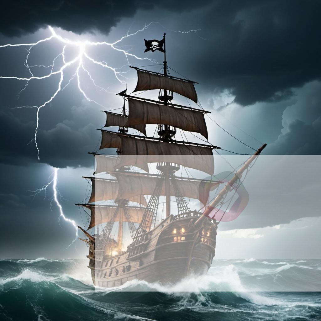 A pirate ship sailing through a stormy sea lightning striking the waves