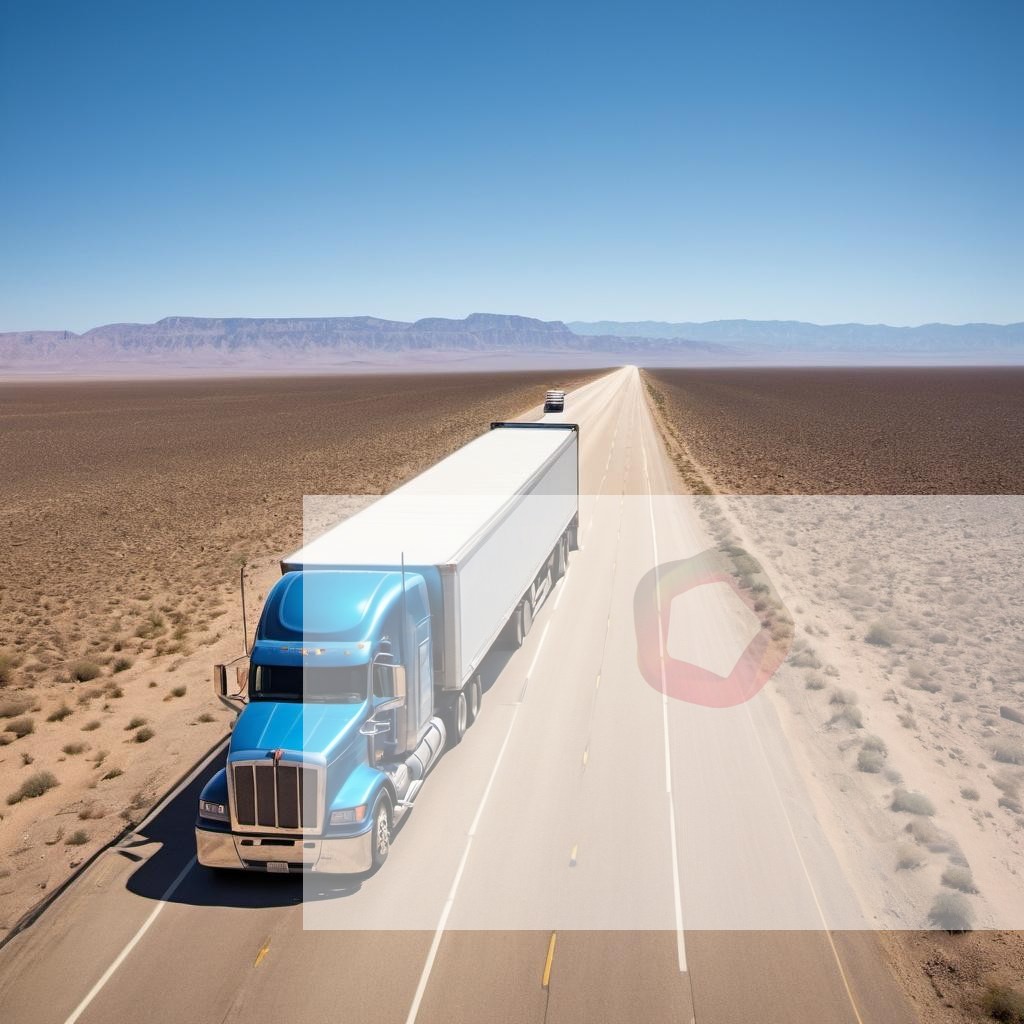 A semi-truck hauling a trailer full of goods across a long highway