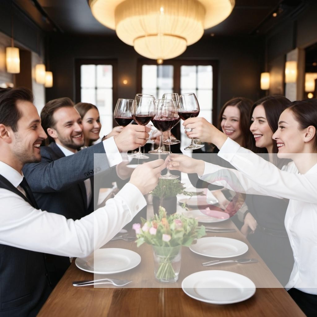 A group of coworkers toasting at a business lunch in a chic restaurant
