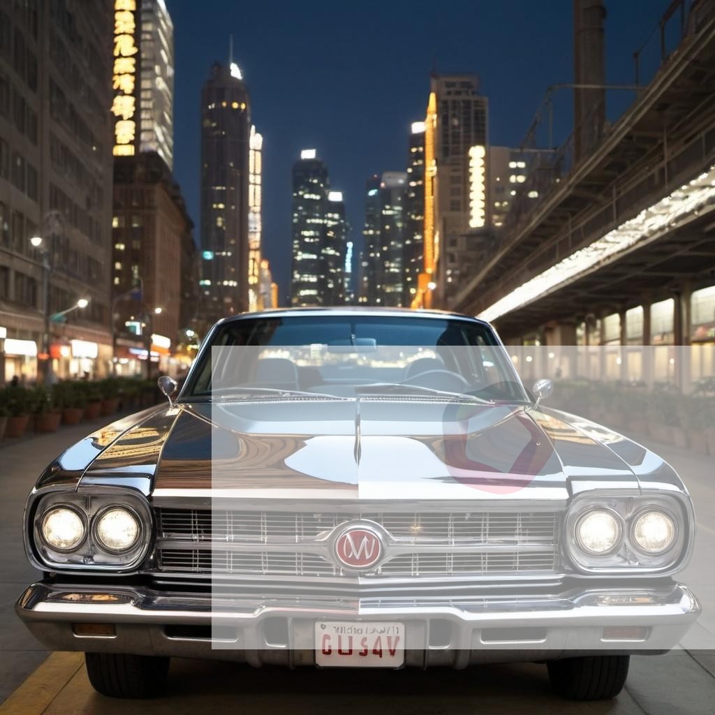 A car with a shiny chrome finish reflecting the city lights