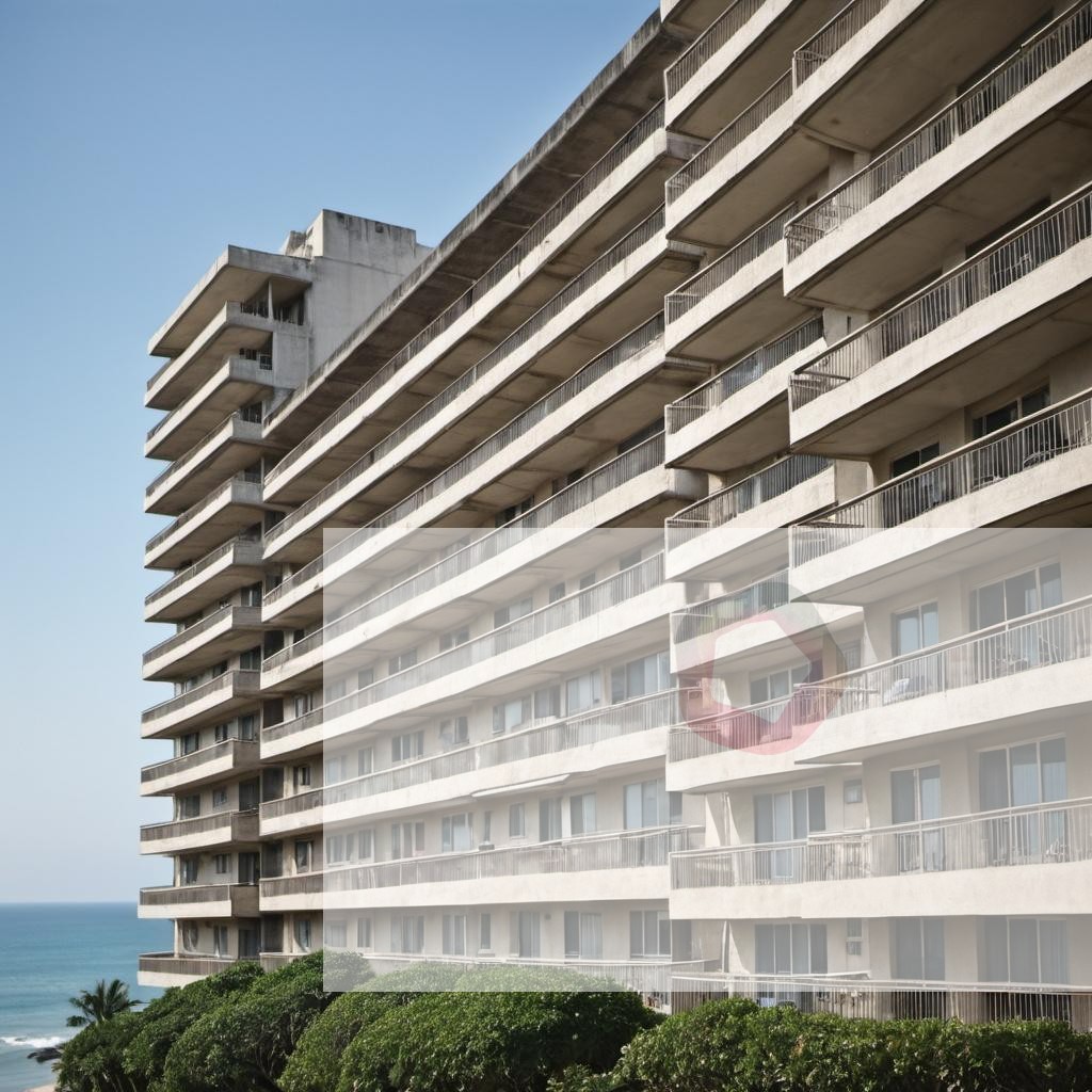 A high-rise apartment building with balconies overlooking the ocean