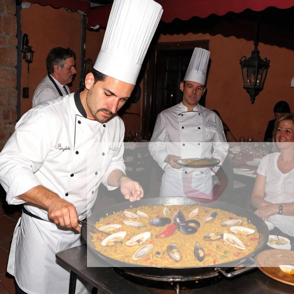 A chef preparing paella in front of guests at a Spanish restaurant