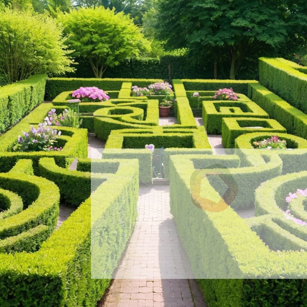 A beautiful garden maze with blooming flowers and hedges