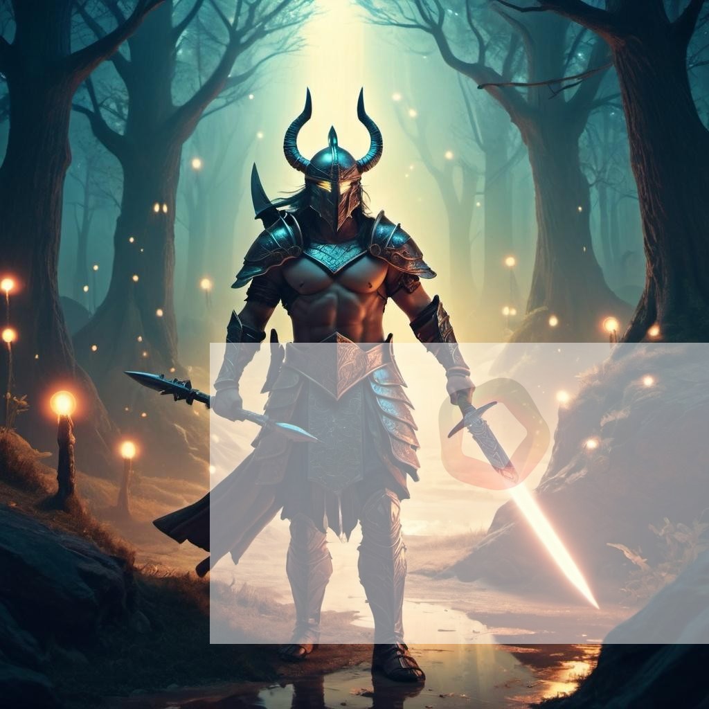 A fantasy scene with a warrior, in a photorealistic style, featuring dynamic lighting.