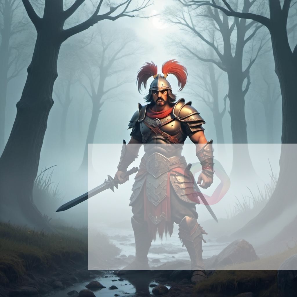 A fantasy scene with a warrior, in a cartoonish style, featuring foggy atmosphere.