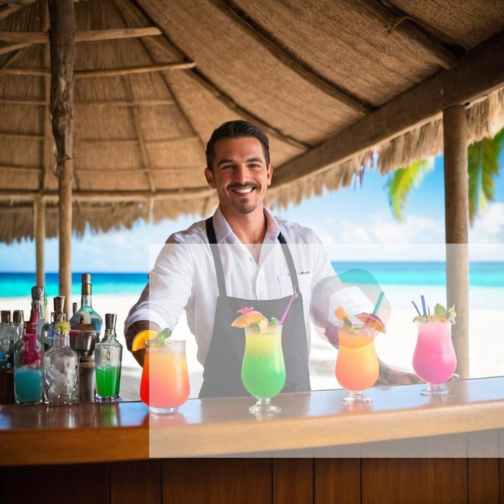 A bartender serving colorful cocktails in a tropical beach bar