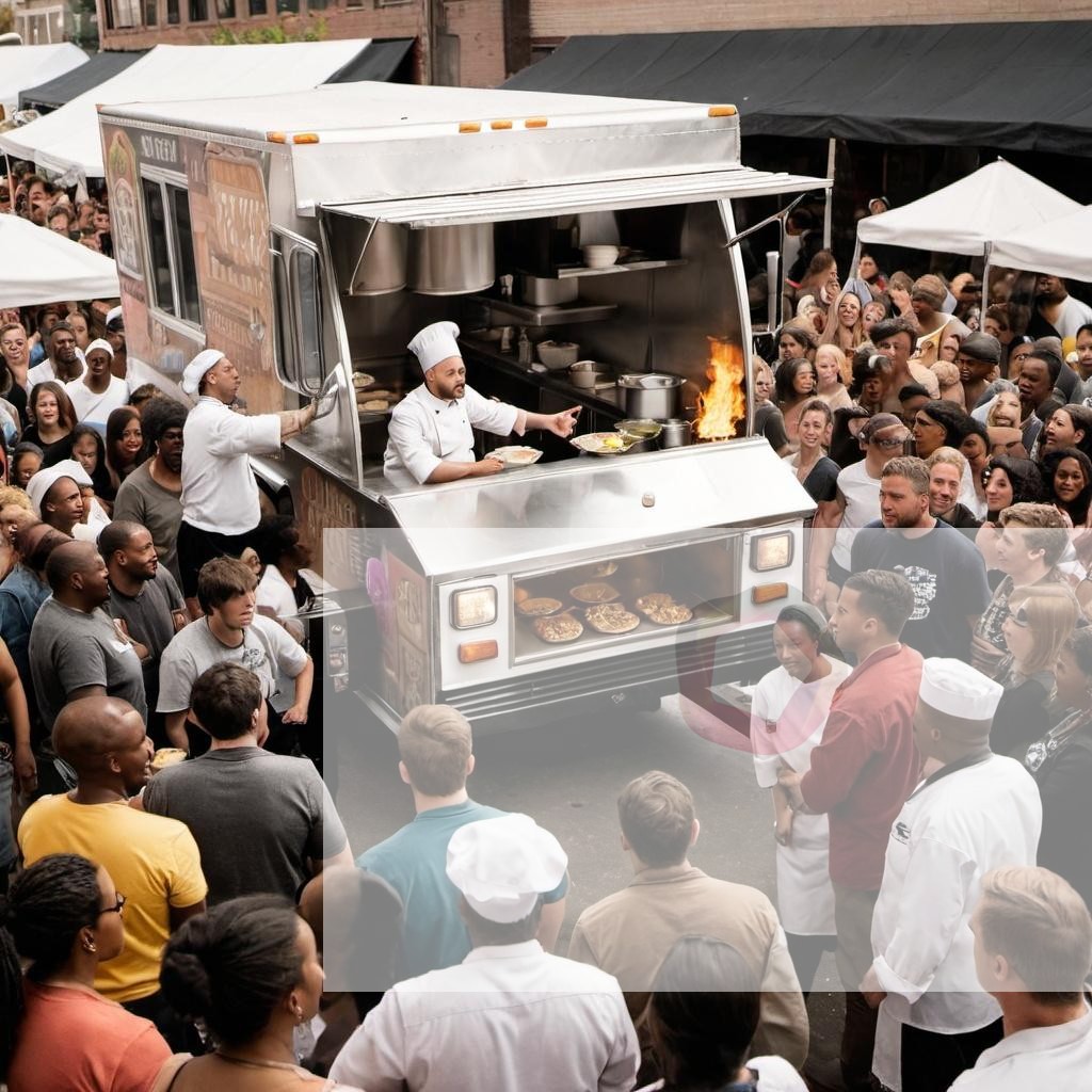 A chef cooking in a food truck surrounded by a crowd of people