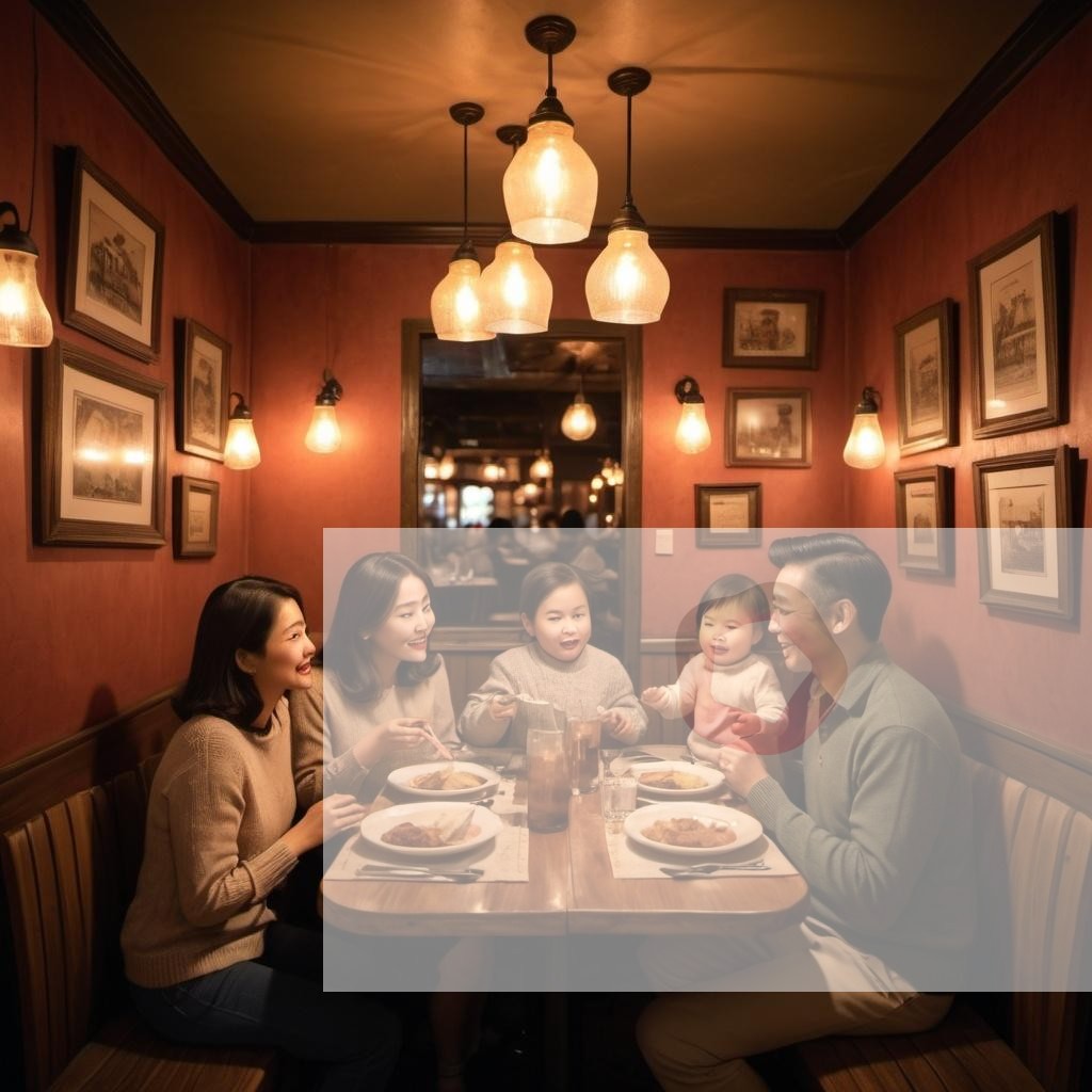 A family enjoying dinner at a rustic pub with wooden tables and dim lighting