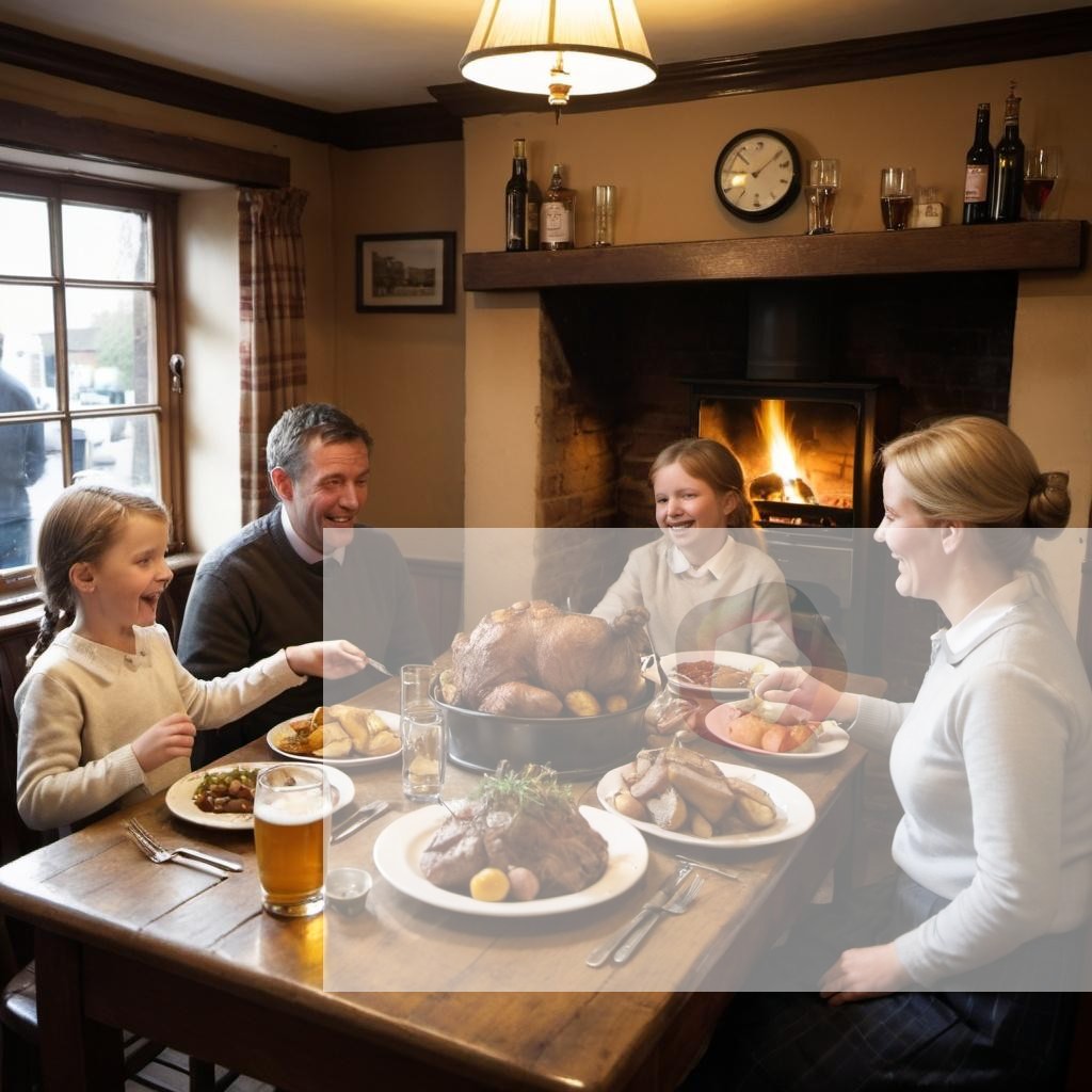 A family enjoying a traditional Sunday roast at a pub with a fireplace