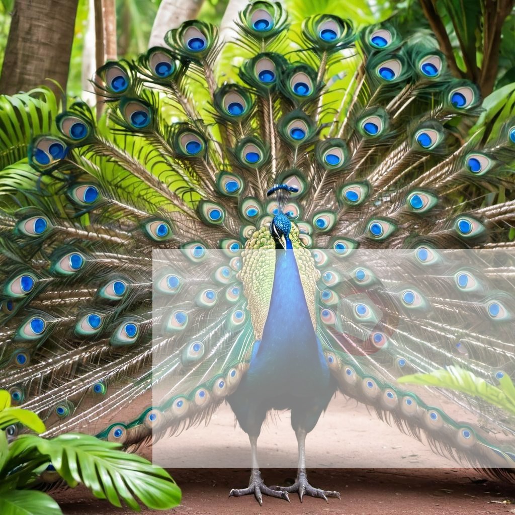 A majestic peacock spreading its vibrant feathers in a lush tropical setting