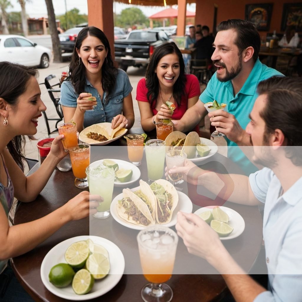 A group of people enjoying tacos and margaritas at a Mexican restaurant