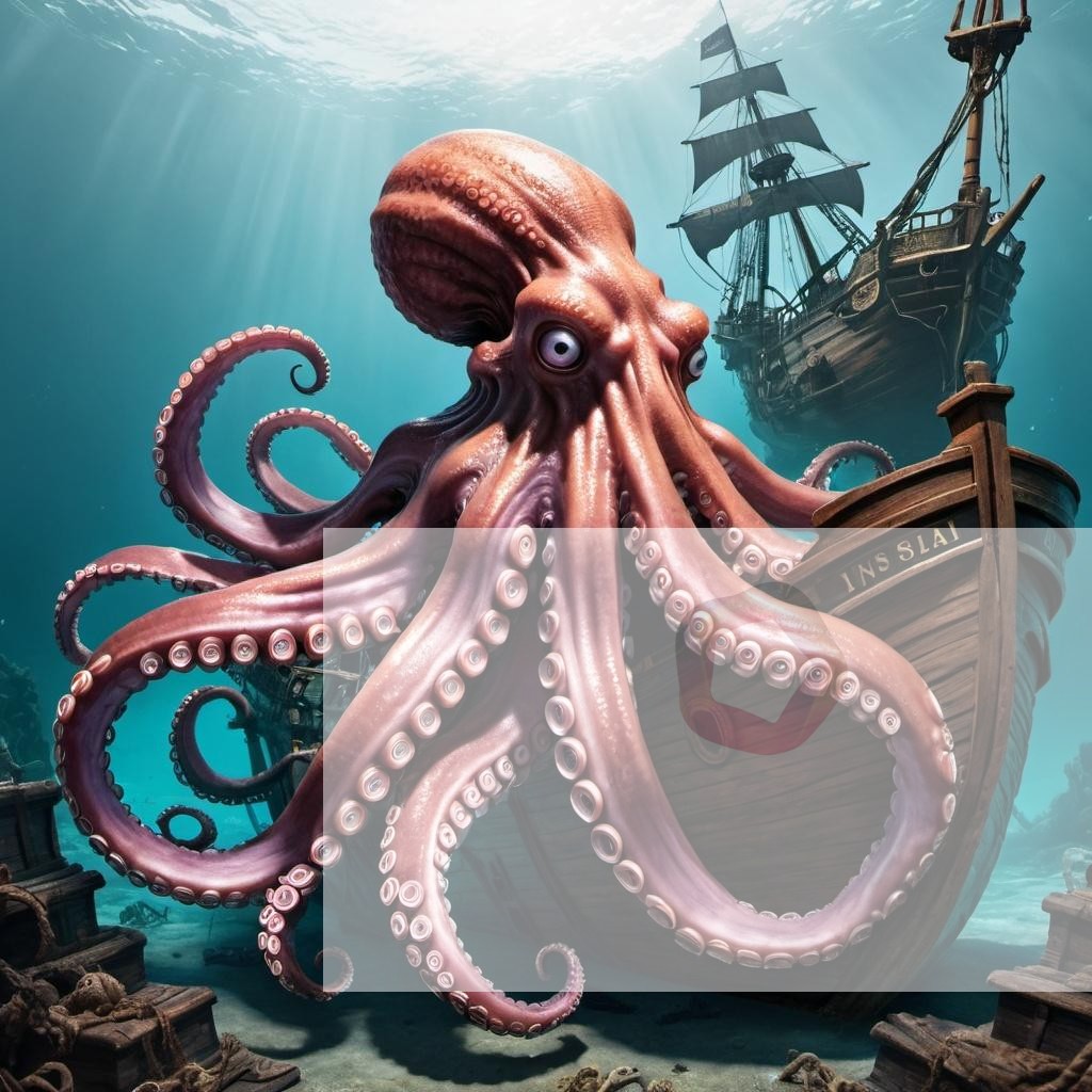 A giant octopus wrapping its tentacles around a sunken pirate ship