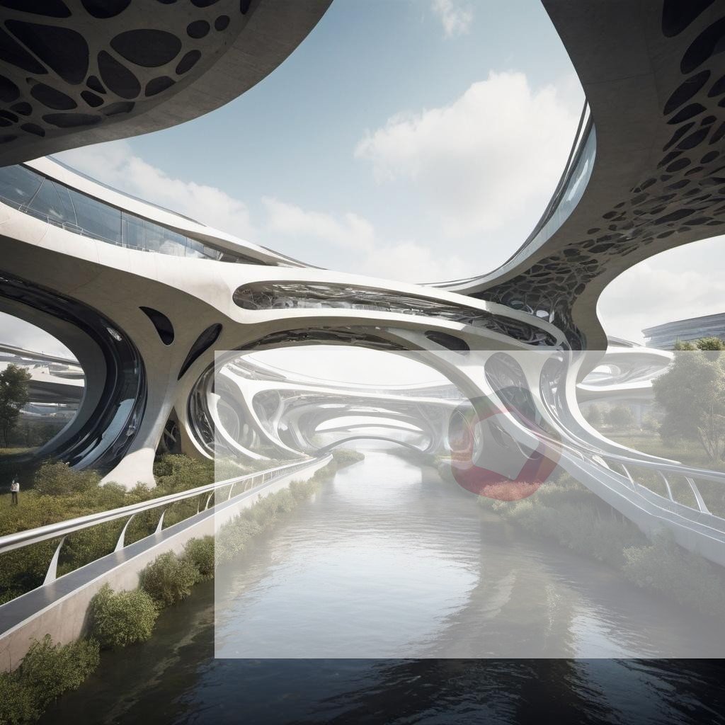 A futuristic bridge with flowing, organic shapes spanning a river