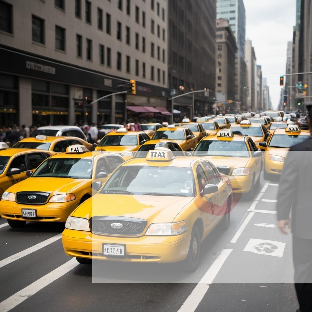A taxi cab weaving through traffic in a busy urban environment