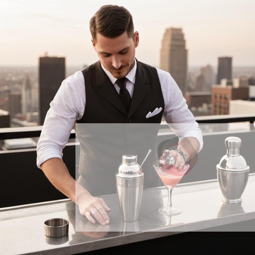 A bartender shaking a cocktail shaker at a chic rooftop lounge