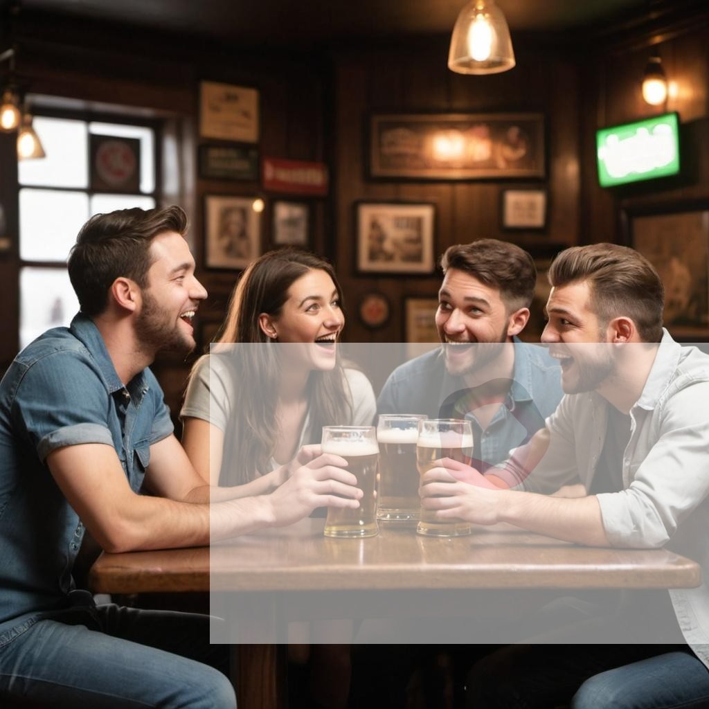 A group of coworkers celebrating a promotion with drinks at an after-work pub