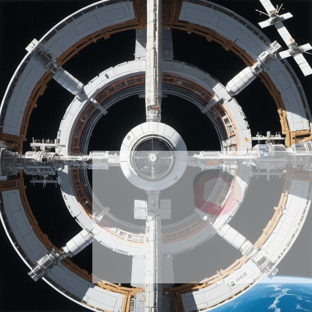 A massive space station with rotating sections generating artificial gravity